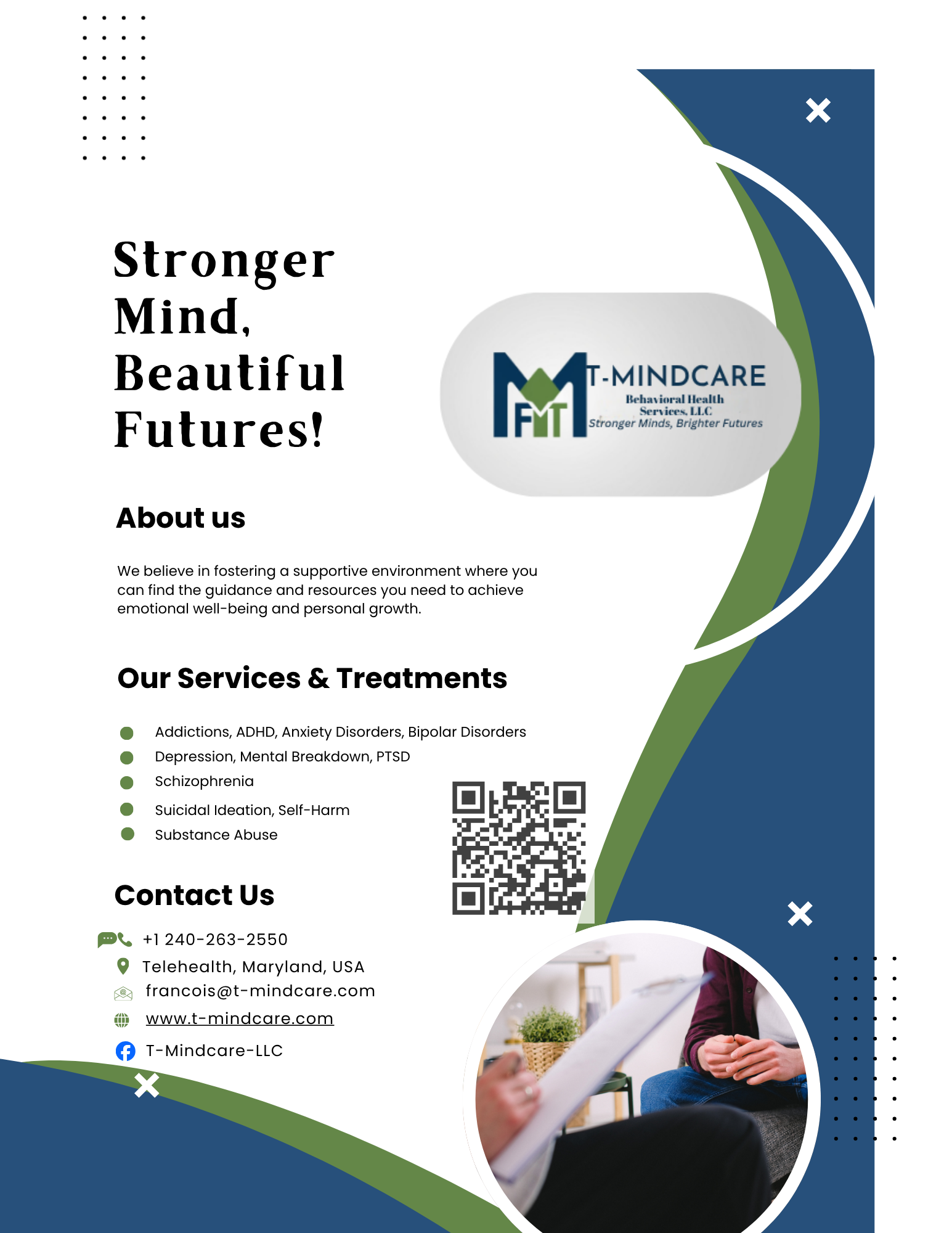 Professional mental health services create a safe space for healing, understanding, and growth. At T-Mindcare in Columbia, MD, we are committed to helping individuals find balance and stability through compassionate, evidence-based care. Our team of licensed professionals takes pride in offering personalized support to address a wide range of emotional and psychological needs. Whether you're navigating daily stress or facing a more complex mental health condition, we provide the tools and guidance you need to move forward with confidence. We specialize in comprehensive psychiatric evaluations to ensure every client receives accurate diagnoses and customized treatment plans. Understanding that every person's journey is unique, our approach focuses on creating solutions that fit each individual's specific circumstances. From schizophrenia treatment to bipolar disorder therapy, we are dedicated to improving mental wellness through effective interventions and ongoing support.