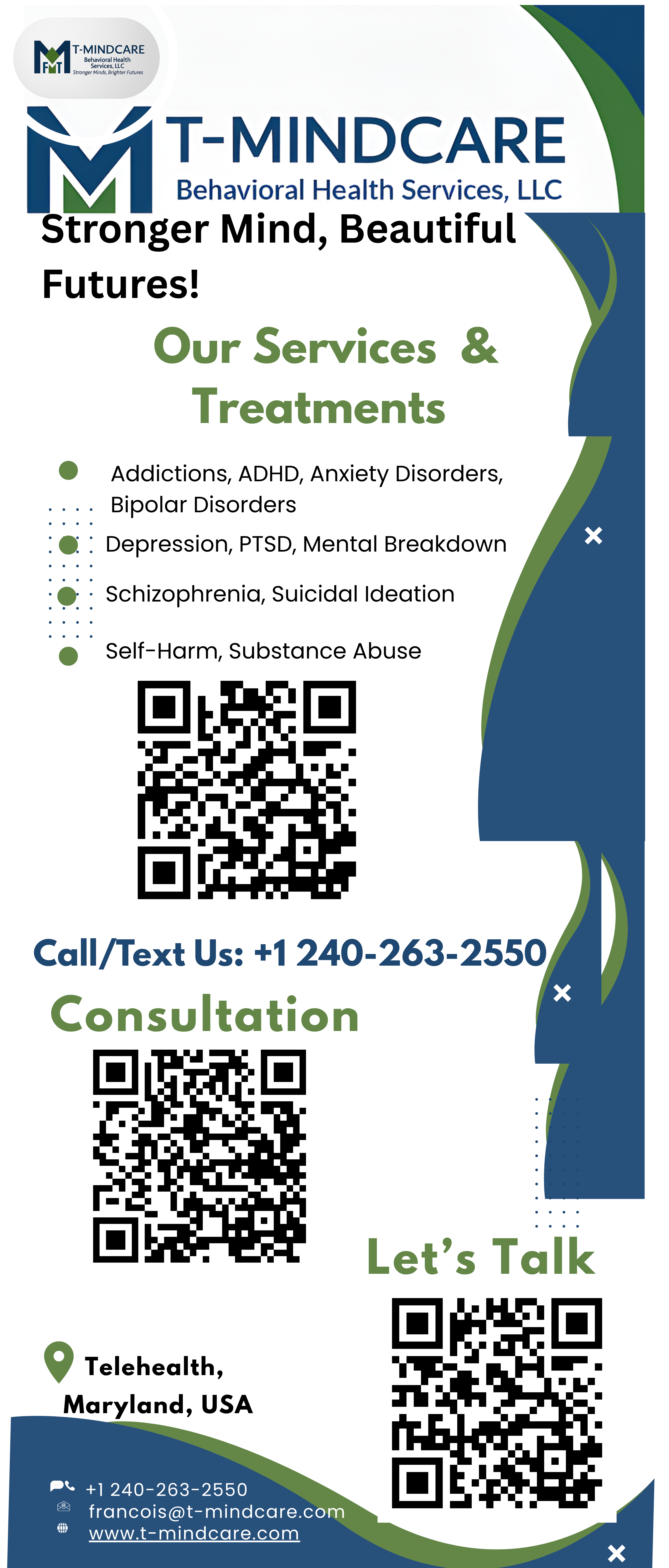 At T-Mindcare, we also provide focused ADHD therapy to help individuals enhance concentration, organization, and overall quality of life. Our clinicians work closely with clients to develop coping strategies and treatment plans that promote better focus and emotional regulation. For those struggling with addiction, our substance abuse treatment programs offer structured, confidential care designed to foster addiction treatment and long-term stability. We understand that healing is a process, and we are here to provide the encouragement and expertise needed to make meaningful progress. In addition, we offer individual therapy sessions that create a supportive environment for personal reflection and growth. Every service we offer is guided by our belief that mental health care should be accessible, respectful, and effective for everyone who seeks it. Call us to schedule a consultation and begin your path toward improved well-being and emotional balance.